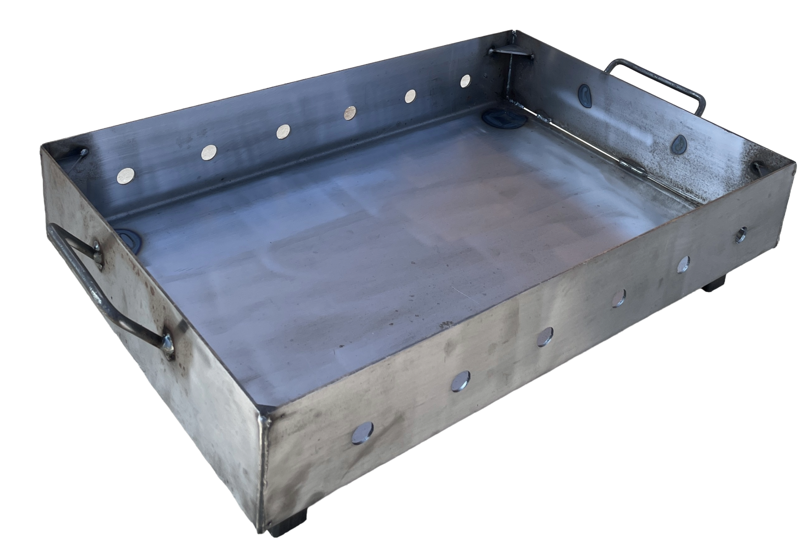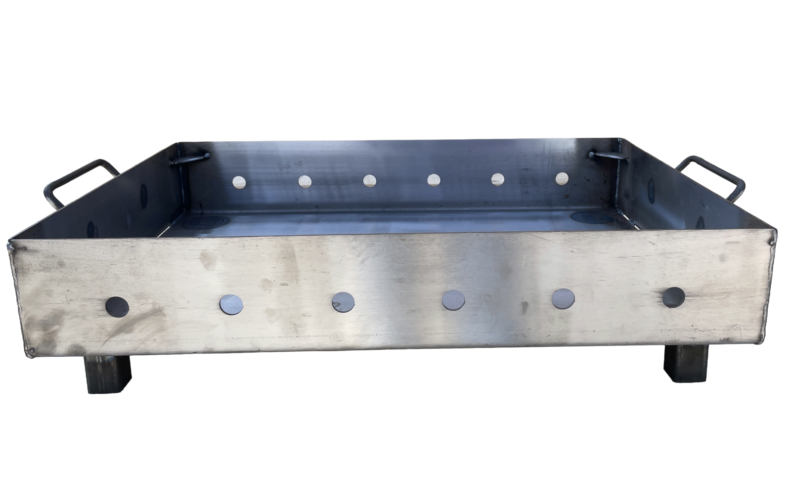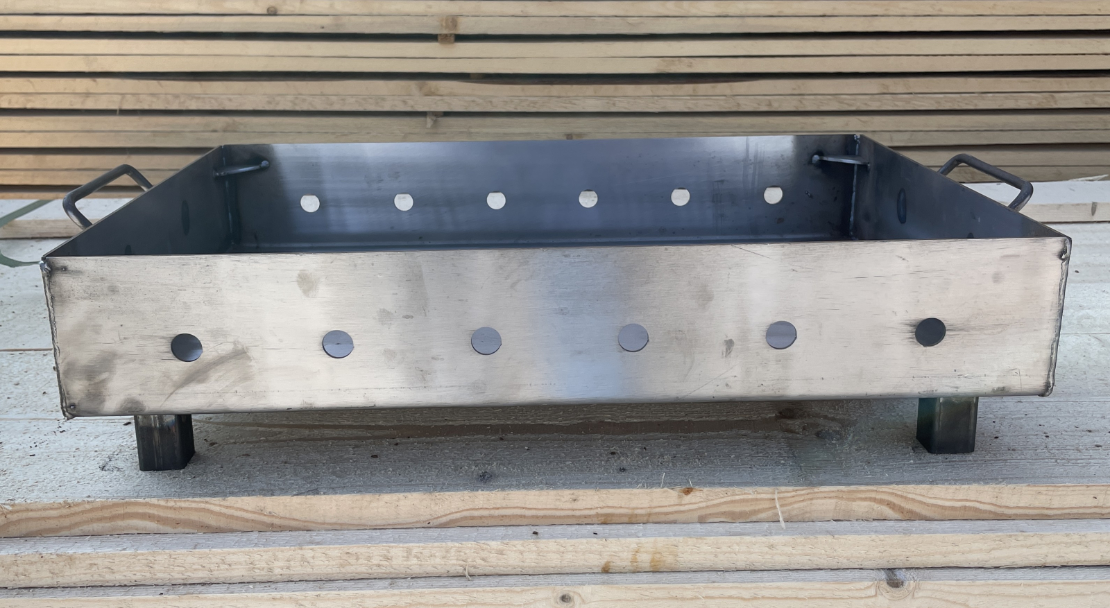 Cuva este realizată din oțel gros de 3 mm, rezistent la temperaturi ridicate și utilizare intensă. Designul dreptunghiular, cu orificii laterale de ventilație, asigură o ardere eficientă și un tiraj constant. Este echipată cu mânere metalice solide pentru manipulare ușoară și picioare stabile din țeavă pătrată, care oferă siguranță și poziționare optimă. Ideală pentru grătare, foc de exterior sau activități în aer liber, cu o construcție robustă și durabilă.